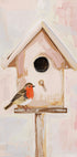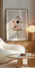 Une atmosphère hivernale calme dans des tons pastel : un nichoir confortable se dresse dans la neige, tandis qu'un rouge-gorge curieux se repose sur le bord. Les coups de pinceau doux, semblables à ceux de l'acrylique, et les formes simples donnent une expression poétique et nordique. Des flocons de neige discrets et des couleurs douces créent paix et confort. Illustration d'Ohkimiko. Parfait pour une ambiance hivernale dans la maison.