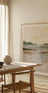 Une peinture de paysage douce et évocatrice avec des coups de pinceau calmes et des couleurs sourdes. Cette image abstraite de paysage aquatique unit la terre, l’eau et le ciel dans un horizon paisible qui évoque des sentiments de calme et de contemplation. Une œuvre d’art parfaite pour ajouter une ambiance apaisante et inspirée de la nature à n’importe quelle pièce.