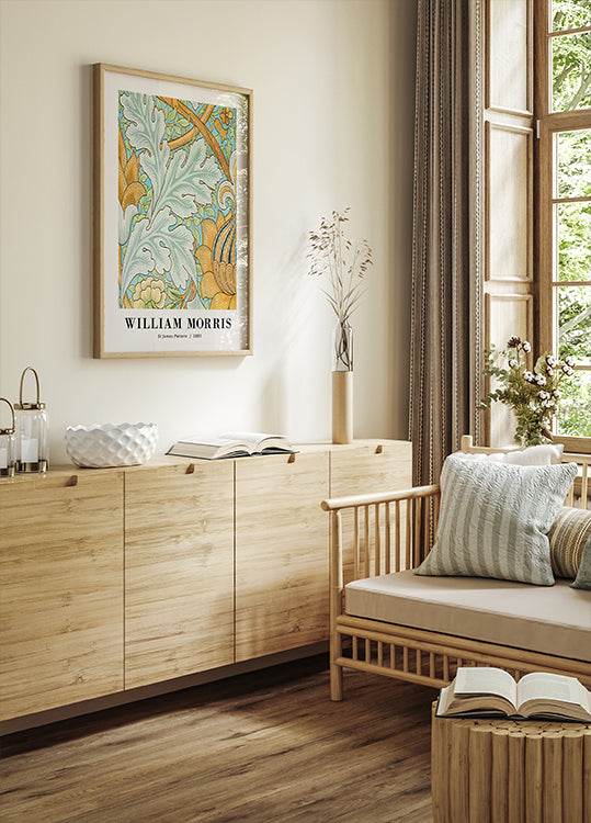 Un motif lumineux et richement décoré de William Morris. Le motif St James (1881) présente d'élégantes feuilles d'acanthe, des fleurs stylisées et des lignes douces dans des tons vert menthe, ocre et bleu pâle. Un superbe exemple du talent de Morris à traduire la beauté de la nature en un design harmonieux.